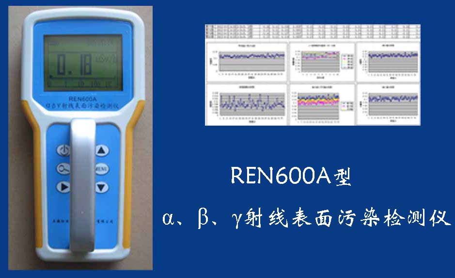 REN600A 表面沾污檢測儀REN600A型α、β、γ射線表面污染檢測儀即可檢測α、β、γ射線,也能檢測到X射線,它采用高速嵌入式微處器作為數(shù)據(jù)處理單元,點陣式大屏幕LCD液晶顯示,讀數(shù)清晰、操作方便,具有400條超大容量數(shù)據(jù)存儲。儀器采用進(jìn)口的大面積MICA蓋革探測器,具有較高探測效率,可進(jìn)行α、β輻射表面污染檢測和X、γ輻射劑量率的監(jiān)測。此外通過配套的RenriCont表面污染管理軟件可將存儲的數(shù)據(jù)讀出后分析。可廣泛用在制藥廠、實驗室、發(fā)電廠、進(jìn)出口商檢、采石場、環(huán)境實驗室、環(huán)境污染調(diào)查、核安全應(yīng)急、緊急狀況營救站、金屬處理廠、地下油田、供油管道裝備、醫(yī)院核醫(yī)學(xué)科、同位素實驗室、環(huán)境保護(hù)和警察局等部門。REN600A型α、β、γ射線表面